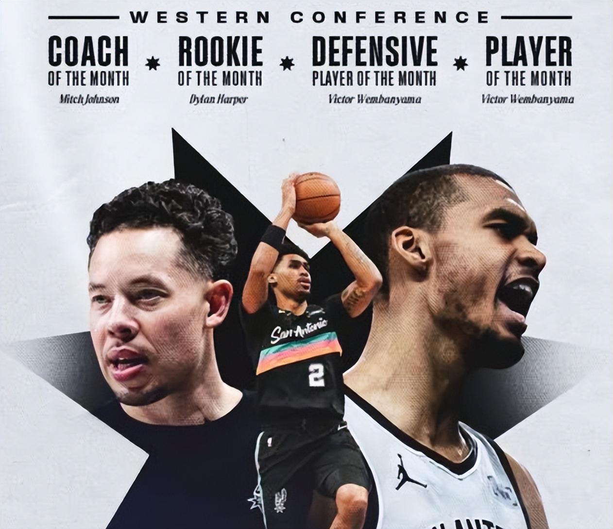 在这个过程中,文班亚马攻防一体,场均仅出战29分钟,豪取22.5分+11.3篮板+3.5助攻+1.4抢断+3.5盖帽。这么打下去,文班亚马会将DPOY收入囊中,也会是MVP之争中的大黑马。哈珀场均出战25分钟,场均贡献12.5分+3.9篮板+4.9助攻,他有着远超同龄人的沉稳与大局观,低调却实用。与此同时,马刺队将帅联手创造一项神级纪录。据NBA官网数据统计,马刺队是NBA历史上首支在同一个月包揽这四项大奖的球队,前无古人!